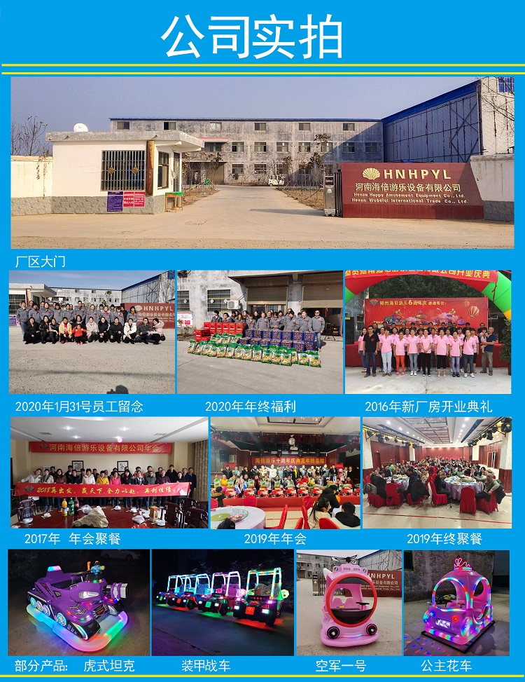 鄭州海倍游樂園設備有限公司,專門從事雙人充氣電瓶車及外罩,海馬貝貝,澳洲巨蜥,虎式坦克,犀牛小愛,寶馬警車碰碰車,新款站警車,夢幻公主車,炫彩摩托車,小飛象,小奶牛,新款保時捷碰碰車,雙人法拉利碰碰車,充氣城堡,充氣水滑梯,充氣水池,仿真坦克,小龍人,裝甲戰車,奔馳大G,挎斗三輪,沙灘車,雙馬拉車,可拆洗毛絨動物車,旋轉飛機,機器人蹬車,飛機碰碰車,坦克碰碰車,雙人座拖拉機,鋼架蹦極,袋鼠跳跳設備,巨人腳步設備,摸石頭過河設備,彩虹傘設備等。產品所選用材料均為PVC、PE復合膜,牛津布、牛津布、TPU、透光牛津布等氣模材料。 以創新求發展,以質量求生存的原則,為社會創造更大的社會價值。 超前的設計精良制作的實力,立異創新、選料考究、設計新穎、做工精細、質優價廉,經久耐用,可靠,娛樂性強等特點深受廣大用戶青睞。