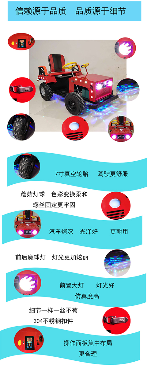 我記得我小的時候,沒見過這種廣場上的游樂車,更別說去做了,現在社會進步了, 廣場上的各種各樣的游樂設備無奇不有啊。小朋友都是喜歡那款車坐那款,不會看您誰是誰,所有做游樂設備的老板們要想做廣場生意,首先您的車子小朋友要喜歡,看上去就要做,一座上都不愿意下來,那樣您才能掙到錢,怎樣小朋友才會喜歡那?首先您的車子燈光效果要特別好,特別亮,您的車子小朋友才喜歡開。