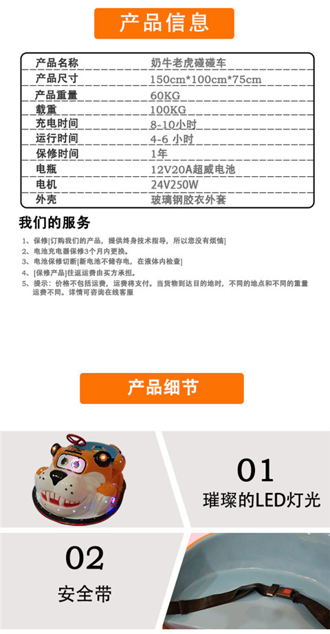 老虎奶牛碰碰車是公司推出的新款廣場玩具車,造型可愛,很吸引廣場小朋友,熱銷全國各地及海外市場。 視頻觀看 點擊