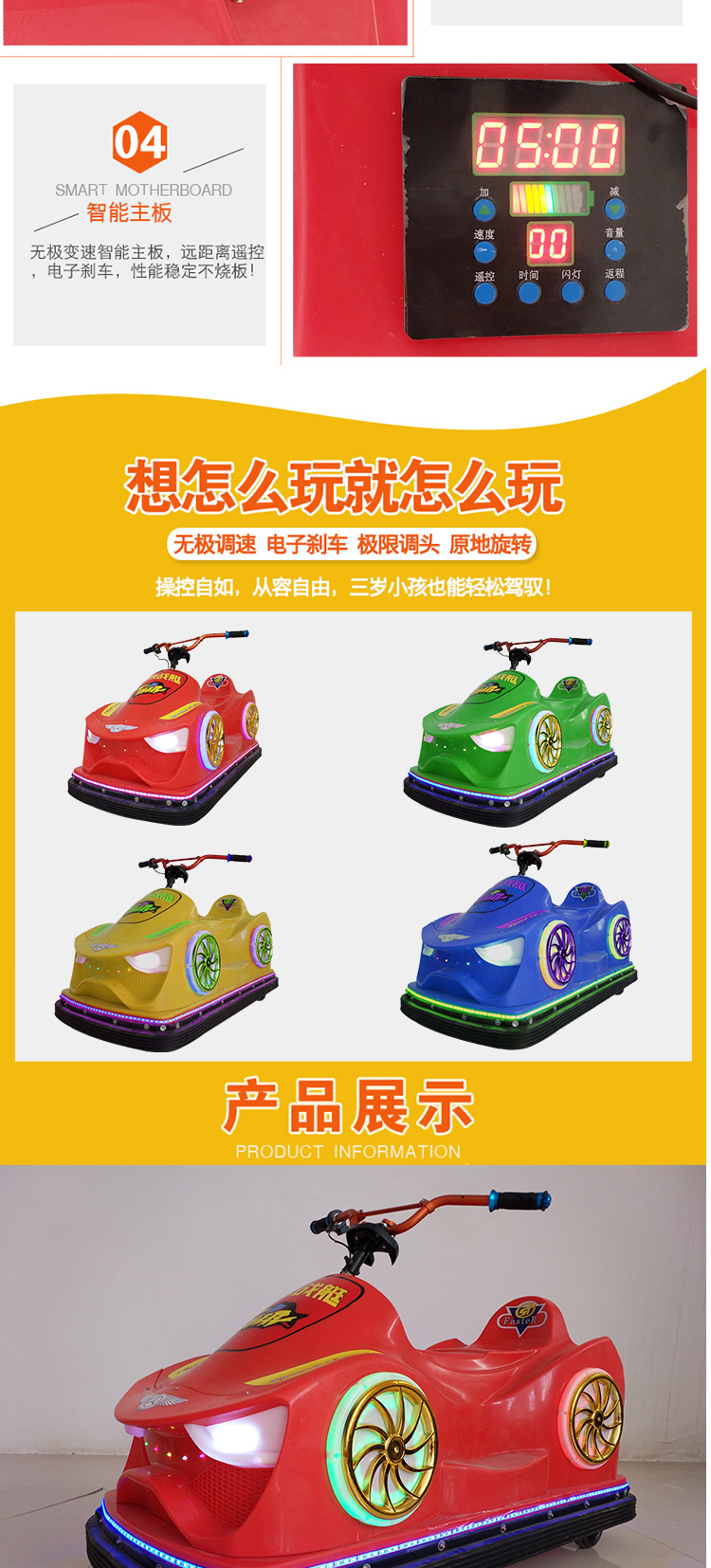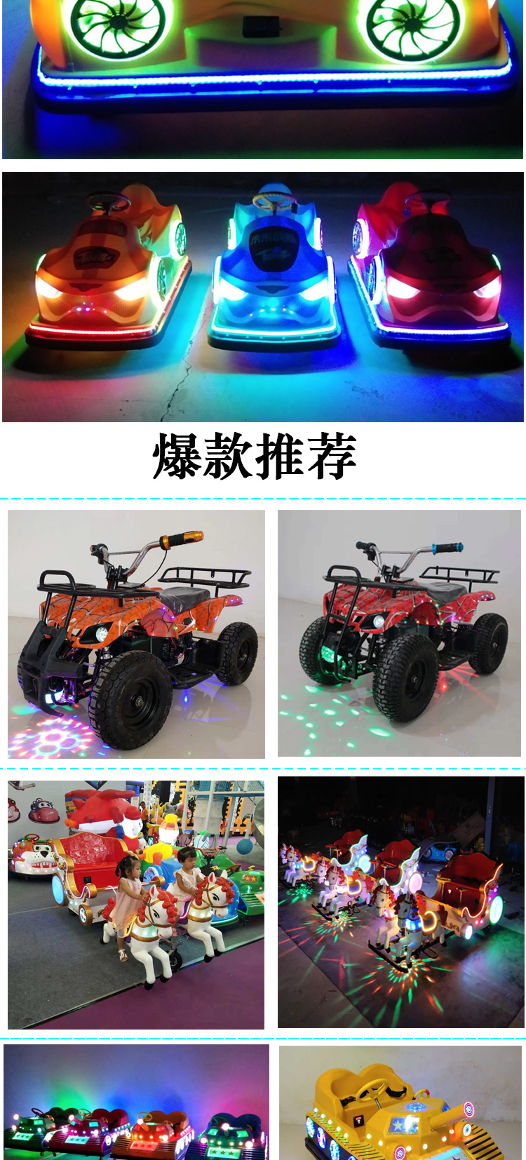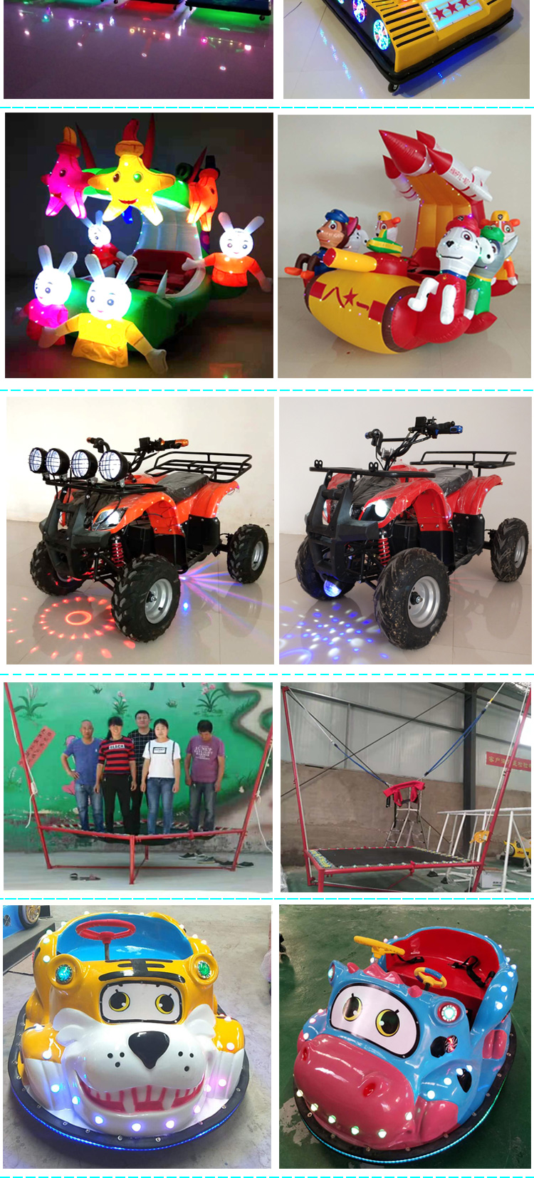 河南海倍游樂設(shè)備有限公司是一家專門從事兒童充氣電瓶車、飛碟碰碰車、機器人蹬車、充氣蹦蹦床、毛絨動物車等產(chǎn)品專業(yè)生產(chǎn)加工的企業(yè),擁有完整、科學的質(zhì)量管理體系,先進的生產(chǎn)設(shè)備,一流的技術(shù)服務(wù),完美的售后,一直以來贏得廣大客戶的一直好評,公司以誠信為根本,以質(zhì)量求生產(chǎn),創(chuàng)新求發(fā)展的經(jīng)營理念,一步一個腳印,穩(wěn)步向前發(fā)展。公司本著以客戶三個滿意為基本原則:“產(chǎn)品質(zhì)量的滿意,先進技術(shù)的滿意,售后服務(wù)的滿意”,不斷加強企業(yè)內(nèi)部的綜合競爭力,公司在競爭中求發(fā)展,在挑戰(zhàn)中謀機遇,相信我公司會給您提供優(yōu)質(zhì)、先進的產(chǎn)品,相信我公司會為您提供先進的技術(shù)和完善的售后服務(wù)。勤勞和真誠的我們愿與您攜手并進、共創(chuàng)輝煌。歡迎各界朋友蒞臨參觀、指導和業(yè)務(wù)洽談。