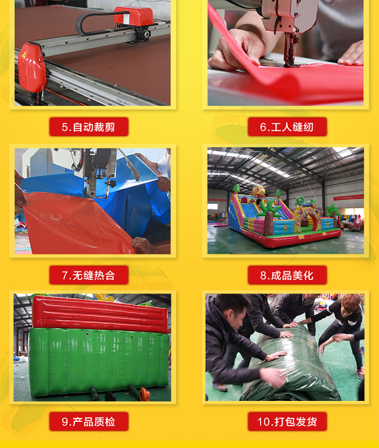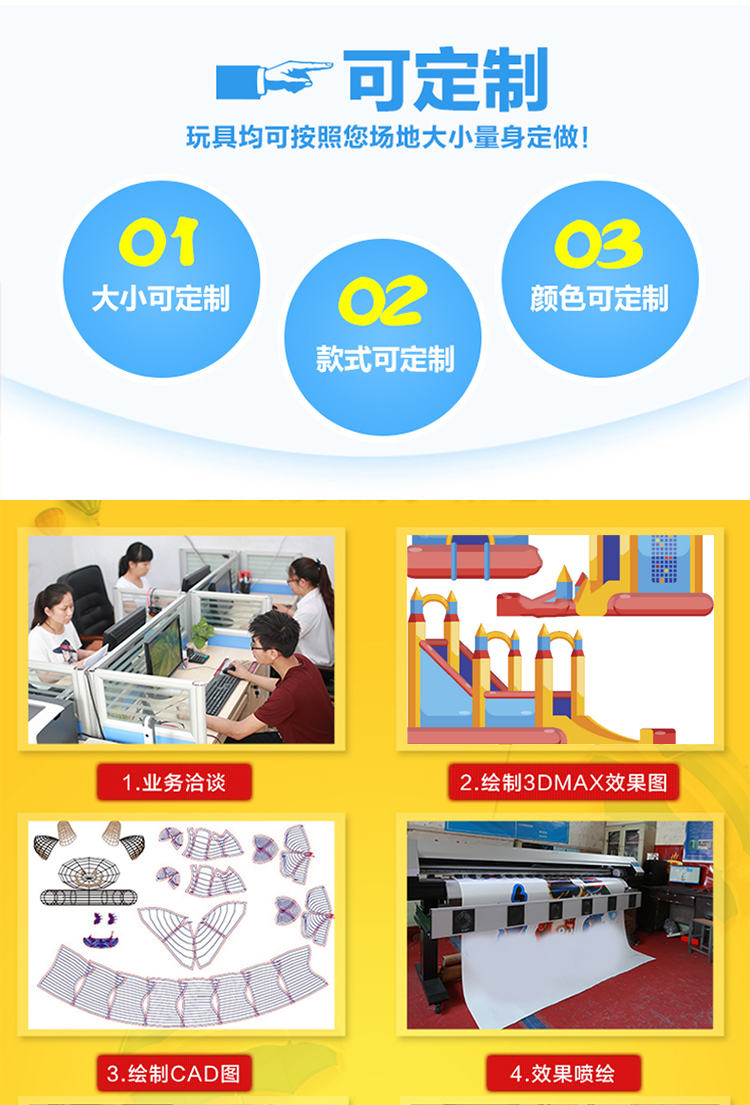 海倍游樂城堡事部專注城堡數(shù)十年如一日,有專門的設(shè)計和研發(fā)部門,有專門的城堡生產(chǎn)車間,接受來樣訂制,來圖設(shè)計,可以根據(jù)您的場地大小長寬多少制作